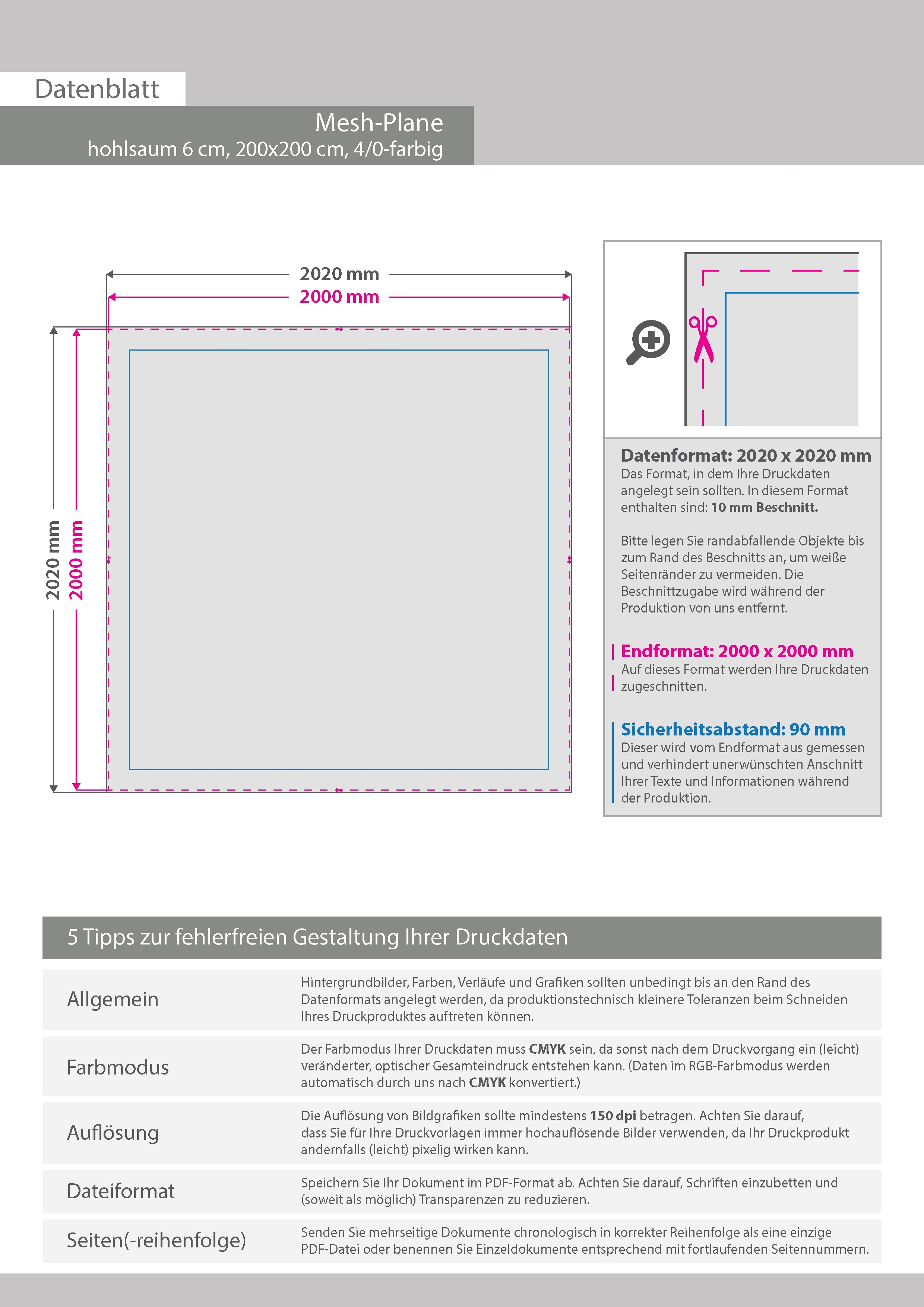 Hochwertige Mesh-Plane 200 x 200 cm, 4/0-farbig bedruckt, Hohlsaum oben und unten (Durchmesser Hohlsaum 6,0 cm)